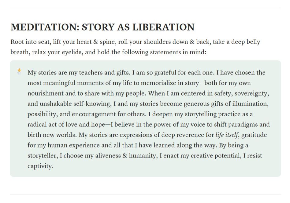 This free course is an invitation to tend to the body, voice, memories, and meaning-making practices that allow your sovereign self-expression to flow freely and your stories to (re)generate the communities you crave.
