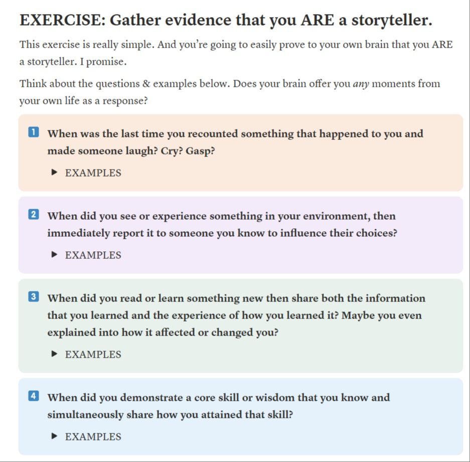 Storytelling is your birthright as a living being. And whether you realize it or not, you're already doing it — every time you recount something that happened and make someone laugh, every time you share what you learned and how it changed you, every time you demonstrate a skill while weaving in the story of how you got there.